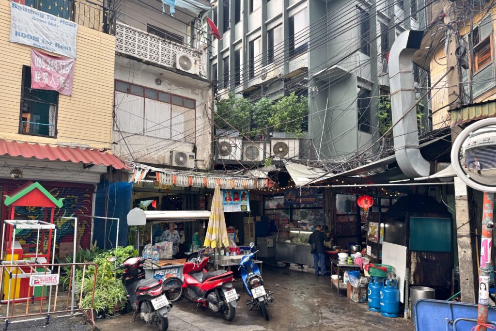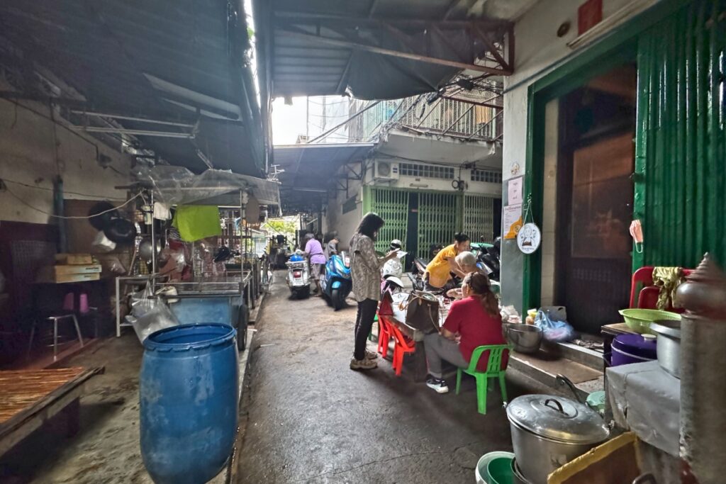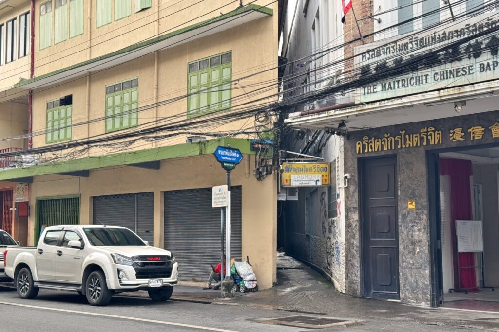 本当にここを入っていっていいのか不安になる細さです。路地の名称はTrok Phantha Chit 1です。
