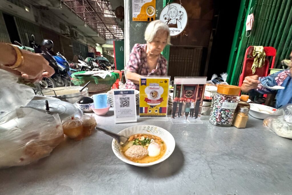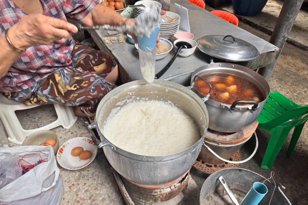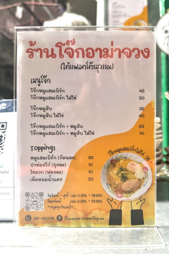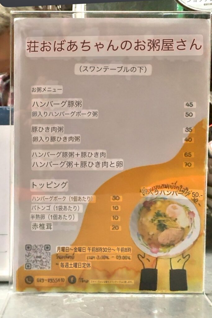 日本語にすると店名は「荘おばあちゃんのお粥屋さん」のようです。おかゆにはハンバーグ、卵、豚ひき肉が入るかどうかという選択肢があるようです。筆者は卵とハンバーグ入りのものを注文してみました。50バーツ(訪問時のレートで約230円)。メニュー表に写真が載っているものもこの組み合わせだと思います。おそらくお勧めなのでしょう。