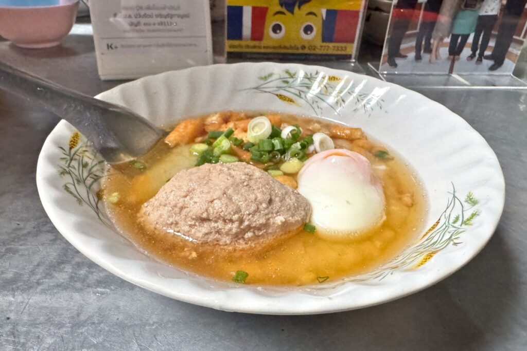 実際に食べてみると激旨でした。ほんのりとした塩味で、お米は潰れ過ぎておらずに粒が感じられるほどです。そこに卵、ネギ、パートンコーと味と食感が異なるものが加わってきます。シンプルなおかゆであっても表情豊かな一品でした。味変の必要なしです。さらにそこにハンバーグも入ってきます。これは日本で言うところの柔らかなつみれのような感じでした。食べている最中には追いスープもしてくれます。これまでタイで食べたおかゆの中でも最高レベルだったと思います。