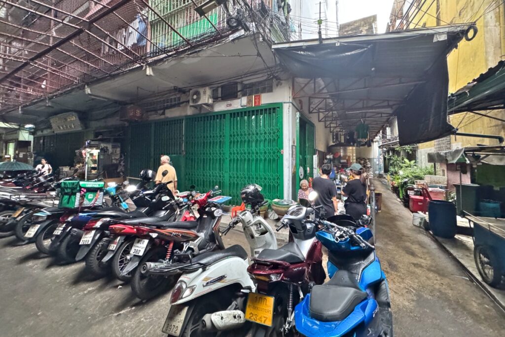 フアランポーン駅からも徒歩圏内で、ジュライロータリーのすぐ近くです。店名はโจ๊กอาม่าจวง ใต้แฟลตโต๊ะสุวรรณ。地図を見てみるとものすごく細い路地にお店があるのがわかるかと思います。南側の路地の入口がこちら。