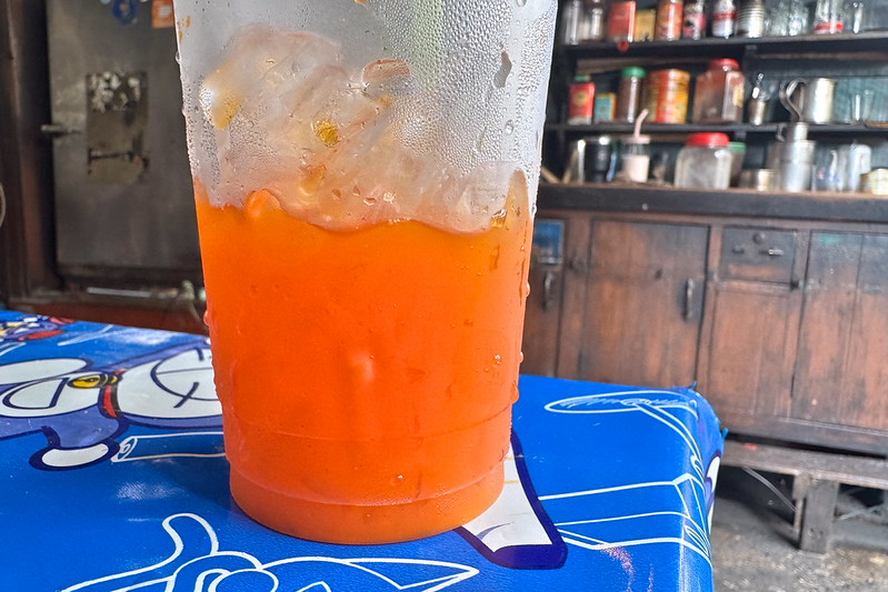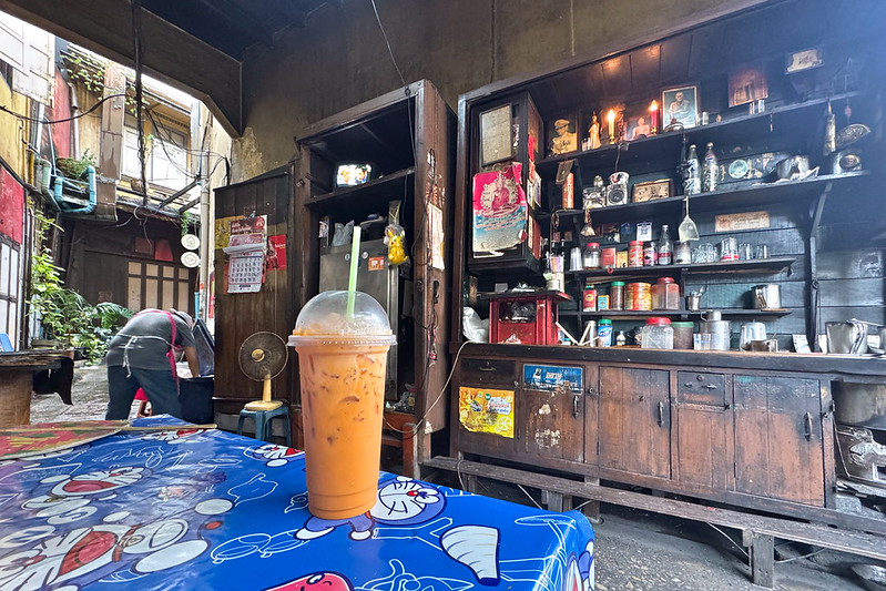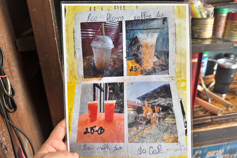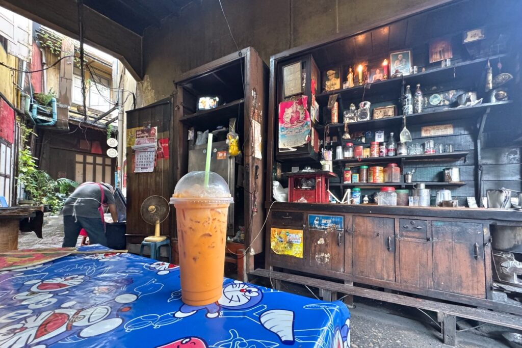 写真付きで商品名と値段は手書きです。いつもだったらコーヒーにするところですが、この日は既に2杯飲んでいたので、タイミルクティーを注文してみました。25バーツ(訪問時のレートで約115円)。なお、甘さをどうするかパーセントで聞かれましたので「100%」でお願いしました。