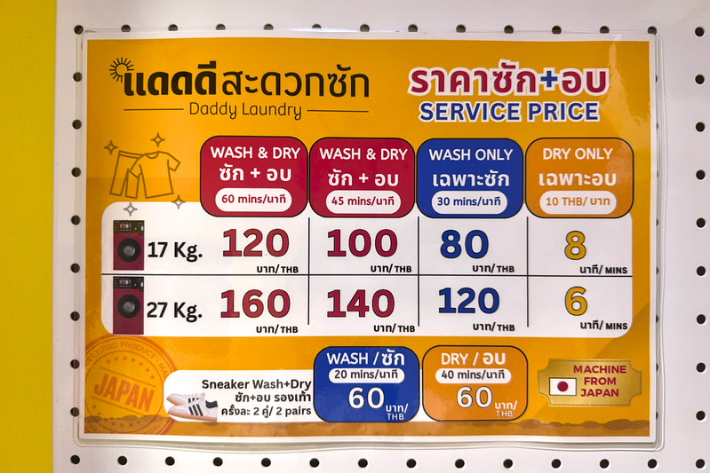 旅行者の場合は洗濯のみや乾燥のみを使うことはまずないかと思います。左側の洗濯+乾燥を見てみてください。17kgまでならば45分で100バーツ(訪問時のレートで約460円)、27kgで140バーツ(約644円)でした。筆者は2日分の洗濯(昼間着るTシャツ2枚、パンツ2枚、パジャマ用Tシャツ2枚)のみなので17kg洗濯機を利用することになります。