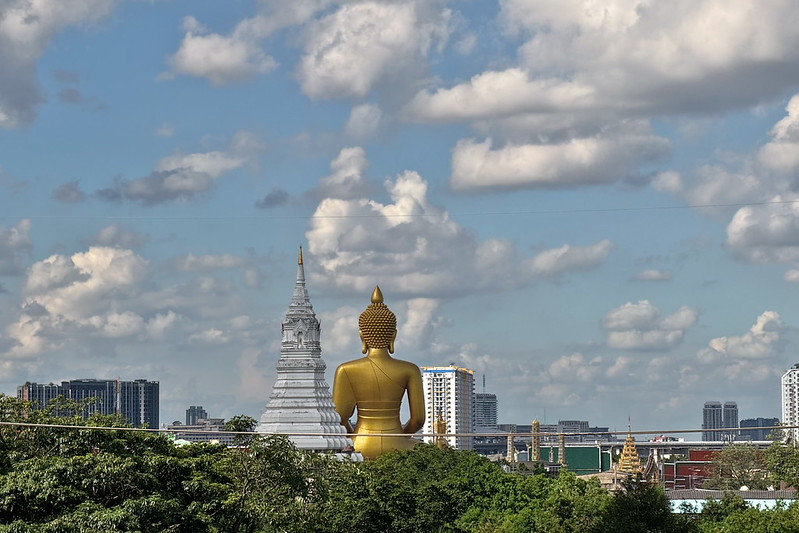 この駅のホームからはワットパクナムの仏塔と大仏を遠くに望むことができます。