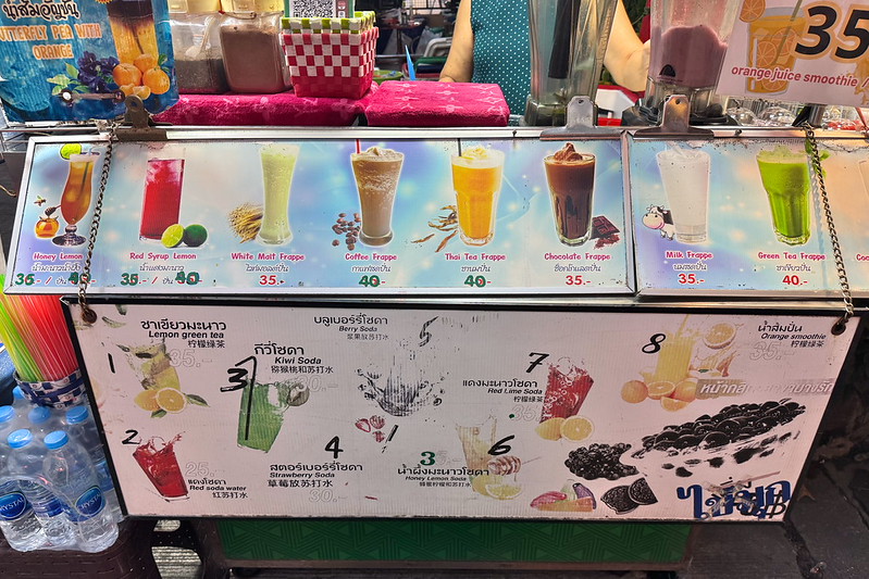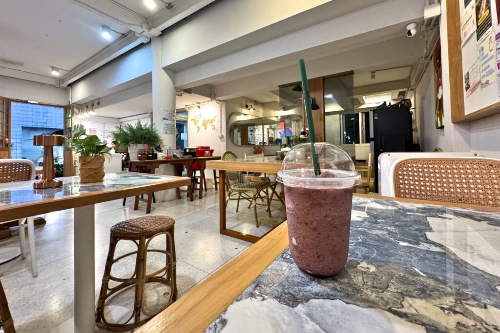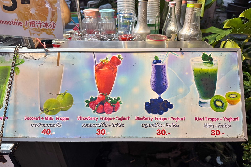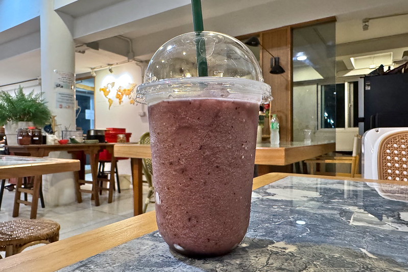 25バーツから40バーツ(訪問時のレートで約115〜184円)です。筆者は迷った末にBlueberry Frappe + Yoghurtを注文しました。Frappeはスムージーです。つまり、ブルーベリーとヨーグルトのスムージですね。30バーツ(約138円)でした。