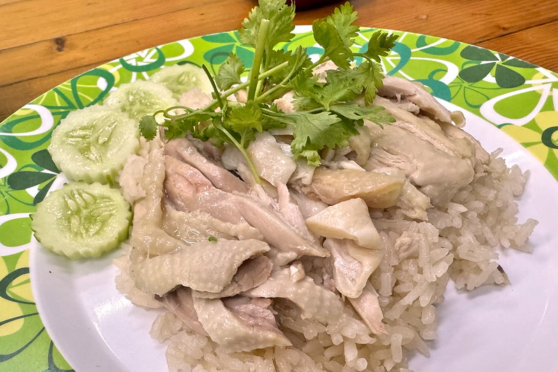 ご飯の上に蒸し鶏、そしてその上にパクチーがのっています。きゅうりも添えられていました。
