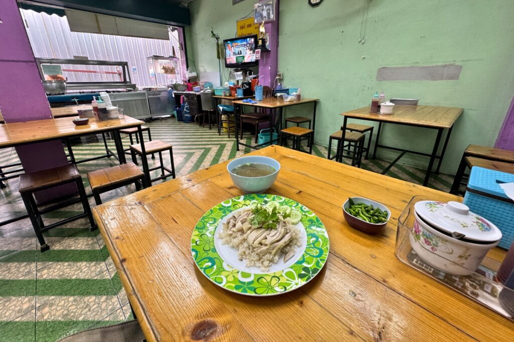 店内に入ってメニュー表を見ようと思いましたが、テーブルにも壁面にもそれらしきものがありません。さて、どうしようかと思ったら、お店の方が「カオマンガイ?」と聞いてきたので、「カオマンガイ」と答えました。どうやらこれで注文完了だったようです。