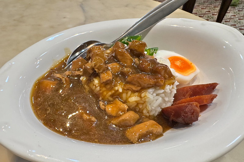 ご飯の上に鶏肉入りのラートナーがたっぷりとかかっています。そこに中華ソーセージ、ゆで卵半分、唐辛子が添えられています。