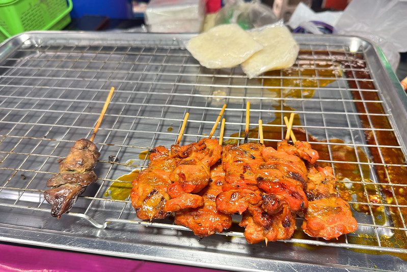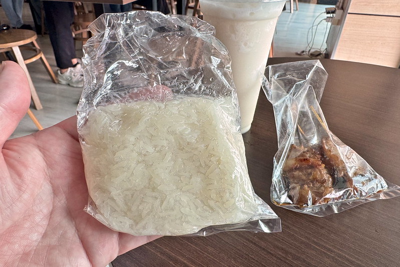 豚肉の串焼きですね。3本入りでした。同じ値段で鶏肉のものもありました。この豚肉が甘めのタレで柔らかくて無茶苦茶美味い!これをもち米と一緒に食べます。