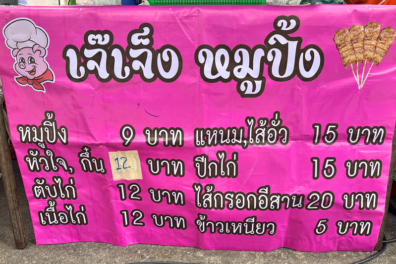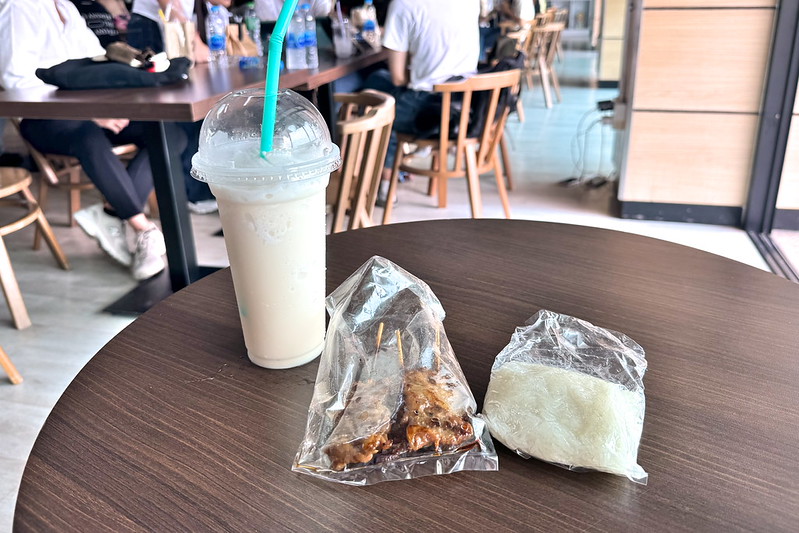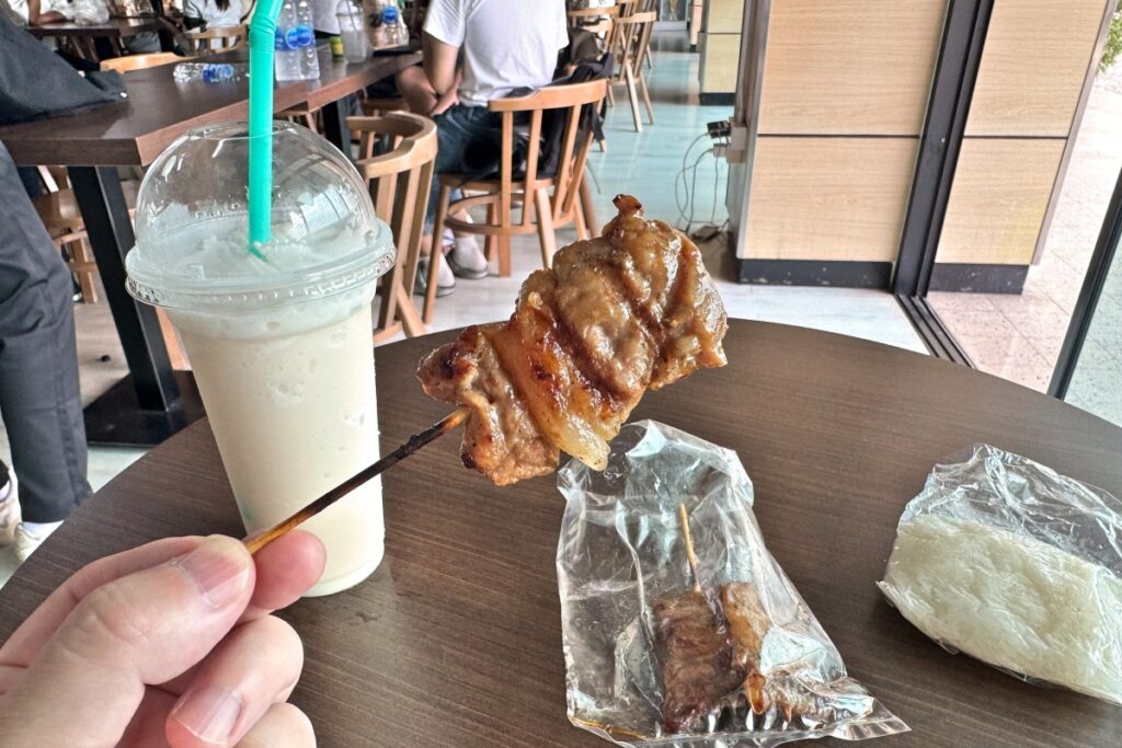 たぶんここに出ているは単品です。これ以外にもムーピンともち米のセットで32バーツ(約147円)のものがあったので購入しました。