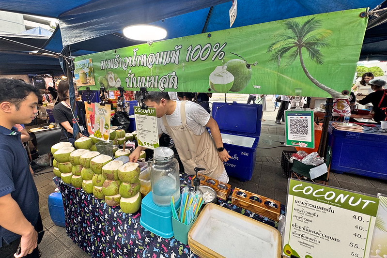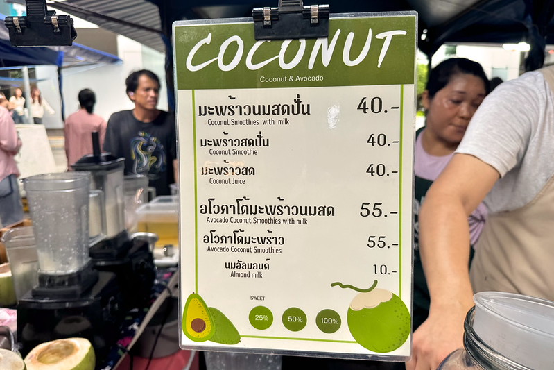 これで合計72バーツ(約331円)です。ココナッツスムージーは安定の美味しさです。市場の中はこれを飲みながら歩きました。タイは暑いのでまず最初にドリンクを買っておくのがいいかもかもしれません。