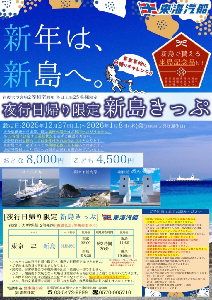2025年12月27日から2026年1月8日までの出発限定の「夜行日帰り限定 新島きっぷ」です。
